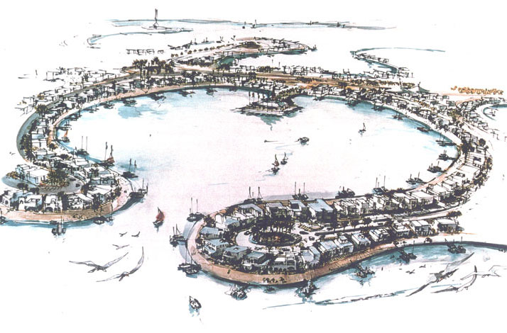 A Typical close up of a single lagoon showing the relationship of Villas to cars and boats. One can feel the ambience and the lifestyle of how this new way of living with accessabilty to both car and boat can become attractive.