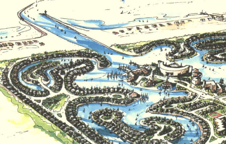 This is a graphic representation of Inland lagoon sites dredged with inland waterways connected to the sea as well as the City's highway system.